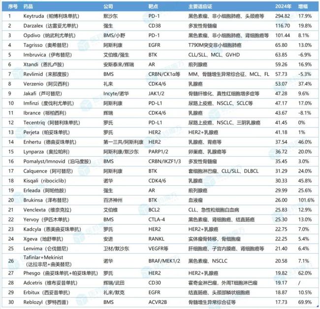 2024年全球肿瘤药销售额TOP30(亿美元)