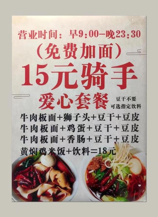 民众提到,在这家板面店里吃一份套餐是20元,但有人点了同样的套餐却只付了15元。市场监管所工作人员前往店内调查时,注意到墙上贴的一张海报。原来店主从套餐中选出了4款,降低价格专门提供给外卖骑手。