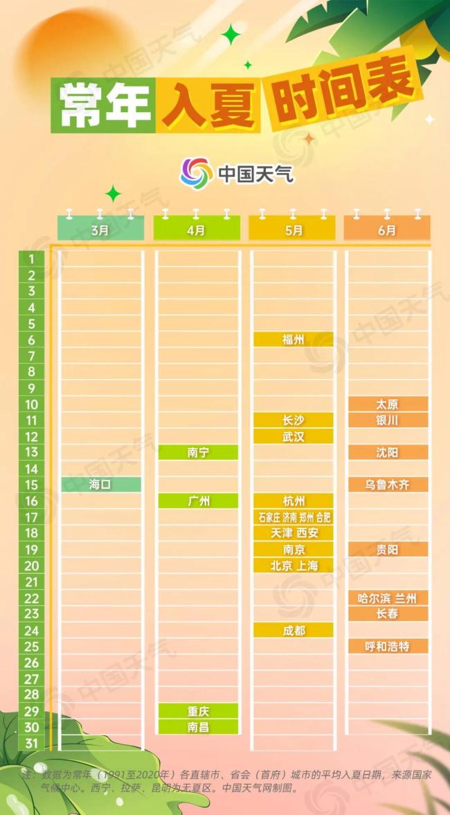大城市如重庆、广州、南宁、武汉、南昌、长沙、福州已陆续进入夏季。与常年同期相比,今年长江流域的入夏时间明显提前。例如,武汉和长沙通常在5月中旬才进入夏季,而今年却在4月中旬就已经入夏,提前了近一个月。