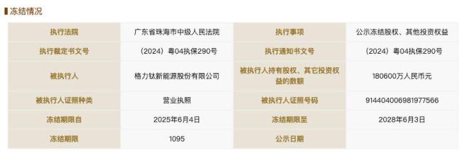 格力钛新能源股份有限公司近日新增一则股权冻结信息,涉及珠海广通汽车有限公司的18.06亿人民币股权。冻结期限自2025年6月4日至2028年6月3日,执行法院为广东省珠海市中级人民法院。