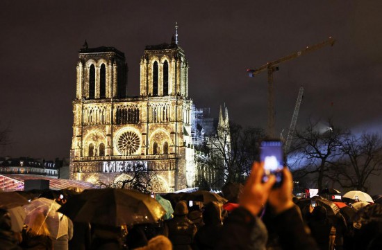 2024年12月7日,人们冒雨在法国巴黎圣母院外参加庆祝仪式,灯光在外墙上打出法语“谢谢”字样。新华社记者高静摄