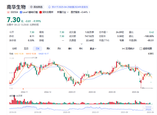 4月23日,南华生物(000504)再度“一”字跌停,截至北京商报记者发稿,报跌停价7.3元/股,跌幅为9.99%。