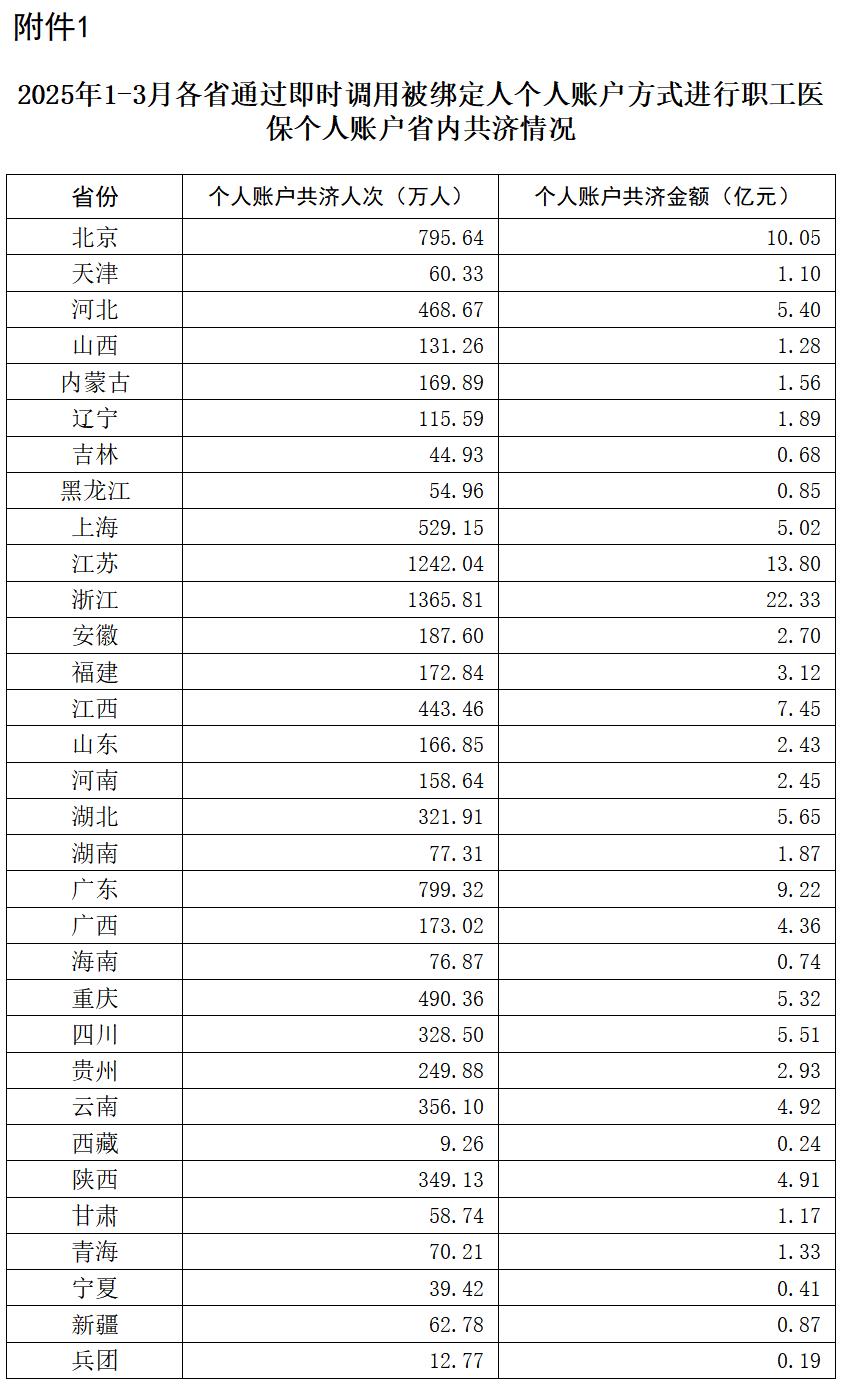 2025年1-3月,通过即时调用被绑定人个人账户方式进行职工医保个人账户省内共济的人次9583.23万,共济金额131.75亿元。